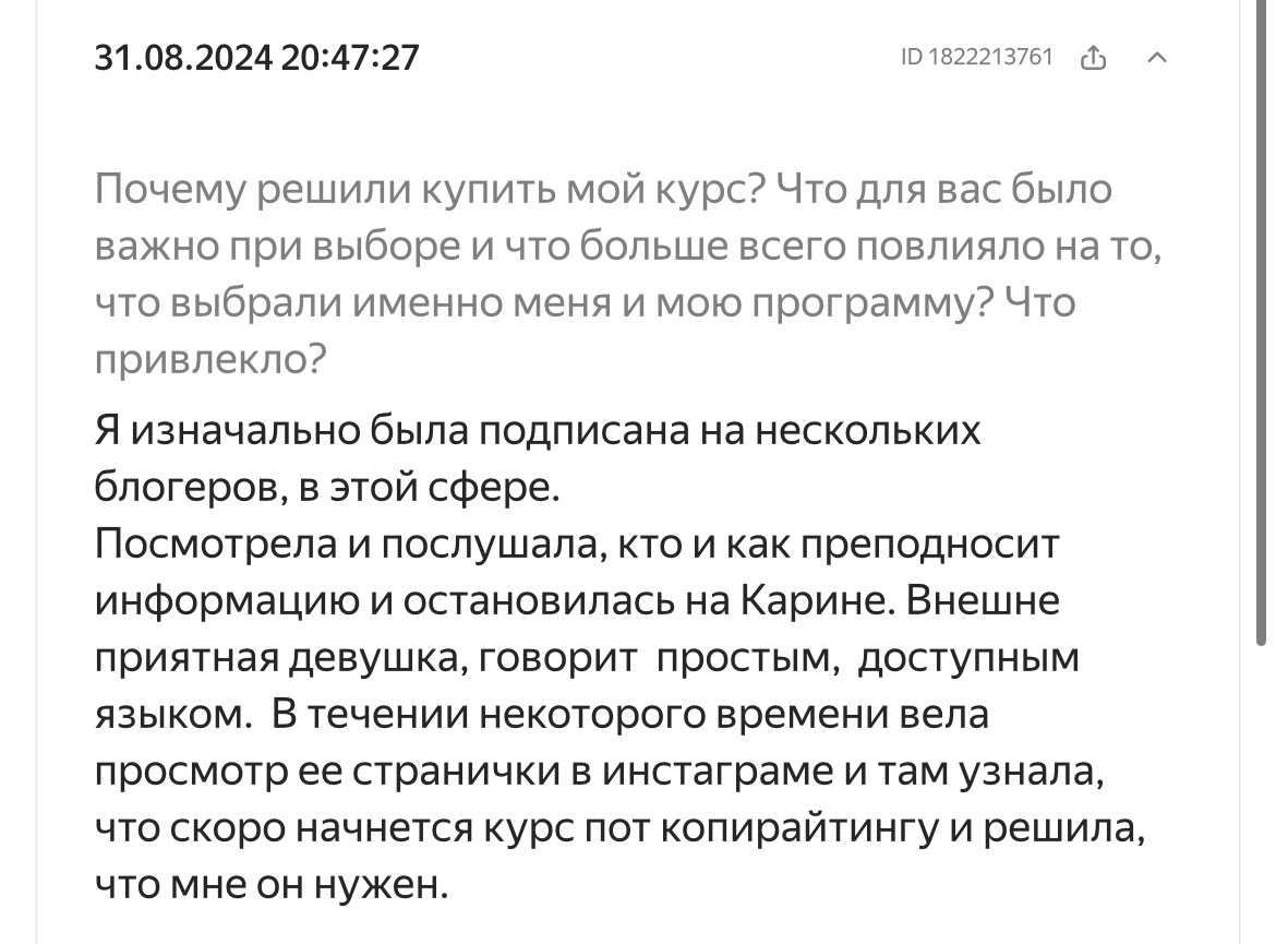 В анкете на первом уроке курса есть такой вопрос «Почему вы выбрали именно меня?». И он там не из тщеславия или любопытства (хотя немного тоже). Он для того, чтобы понимать, на что люди действительно обращают внимание, что для них важно. Что было в анкете в этот раз? Краткая выжимка + несколько скриншотов. 1. Простой, доступный язык «Я изначально была подписана на нескольких блогеров, в этой сфере. Поcмотрела и послушала, кто и как преподносит информацию и остановилась на Карине. Внешне приятная девушка, говорит простым, доступным языком. В течении некоторого времени вела просмотр ее странички в инстаграме и там узнала, что скоро начнется курс по копирайтингу и решила, что мне он нужен». 2. Личный пример в текстах («хочу также!») + доверие как к профессионалу «Вы хорошо пишите, это видно. Плюс хорошая воронка с бесплатным уроком, канал бесплатных материалов. Создаются впечатление, что вы знаете, о чем говорите и действительно можете научить. Сомневалась до последнего, но ваши продающие