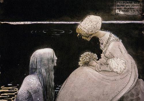 Озерная нимфа стережет озеро или — если это могущественная нимфа — систему озер, которые входят в ее сферу влияния, таким же образом, как лесная нимфа стережет лес. Она предстает перед людьми в виде прекрасной женщины и обычно сидит на камне в воде, расчесывая длинные темно-зеленые волосы. Как и у лесной нимфы, ее спина может быть полой или иногда покрытой чешуей, но, в отличие от русалки, у нее нет рыбьего хвоста, и она ходит на двух ногах. Как и сама вода, нимфа и дает, и отнимает жизнь. Она властвует над обитателями озера, поэтому рыбак, выказавший ей уважение и пожертвовавший несколько монет или щепотку жевательного табака, получал хороший клев и предупреждение о надвигающейся непогоде. В отличие от нэка, по злобе обрекающего людей на погибель, озерная дева редко топит людей из чистой кровожадности, а лишь в отместку за оскорбление. По крайней мере, пока не слишком сильно проголодается... Тот же, кому удастся ее разозлить, вполне может закончить свою жизнь мучительной смерт
