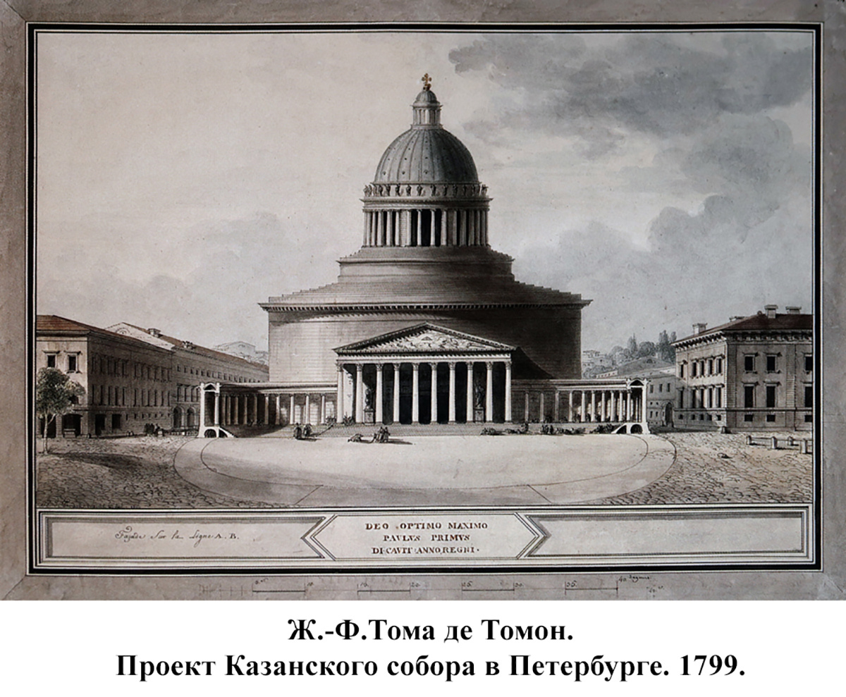 В краткое правление императора Павла наметились новые тенденции в русском храмостроении, связанные с проведением масштабных архитектурных конкурсов на проектирование и постройку крупных соборов, несущих мемориальную функцию. Первой вехой стал конкурс на постройку Казанского собора в Петербурге, в котором принимали участие Ч. Камерон, Н. А. Львов, П. Г. Гонзаго, Ж.‑Ф. Тома де Томон и А. Н. Воронихин. Как известно, одним из условий конкурса было сходство с собором Св. Петра в Риме. При этом тема ротонды стала одной из центральных в представленных проектах.