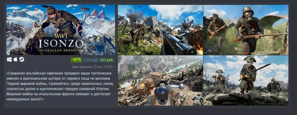 Прямо сейчас у вас есть возможность окунуться в атмосферу ожесточенных боёв первой мировой на территории северной Италии и всего за 363 дублона! Скидка продлится до 9 сентября. Также прямо сейчас идёт продажа набора всей серии игр WW1 (Verdun, Tannenberg, Isonzo) покупка этого набора позволит сэкономить вам целую тысячу дублонов! А еще сейчас продается набор Isonzo+косметика, там и каски, и усы с сигарами, и форма, в общем много чего для украшения своего вояки. А еще действуют скидки на отдельные косметические наборы, такие как "Первая волна", "Зимние войска", "Экспедиционные войска" и "Royal Units Pack". Например, в составе комплекта «Первая волна» вы найдете пакеты DLC ключевых войск Isonzo: «Резервисты», «Опытные бойцы», «Элита» и «Альпийские стрелки». Комплект «Первая волна» содержит историческую униформу и аксессуары для итальянских и австро-венгерских войск: как для элитных солдат-ветеранов, так и для неопытных, но храбрых резервистов и особых отрядов альпийских стрелков. В общем