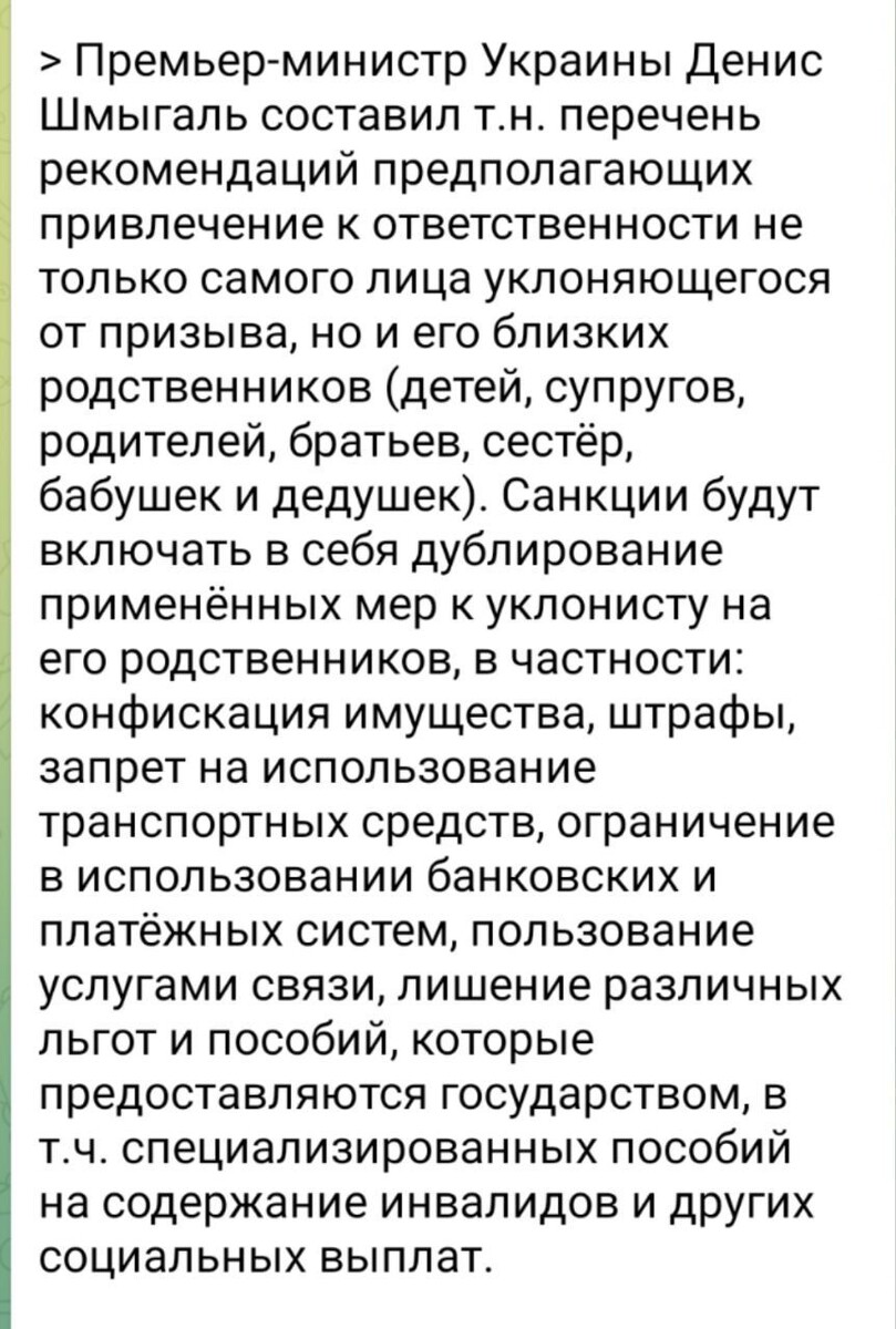 То есть, если ты бегаешь от ТЦК или не вернёшься на Украину из Европы, куда бежал от призыва, то твоей бабушке перестанут платить пенсию, твоей жене заблокируют банковскую карту, дочь отчислят из института, заберут машину у сына, будут отключать от интернета и мобильной связи всю семью.