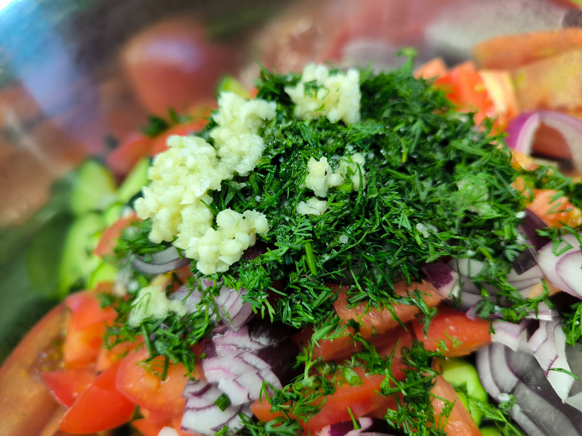 Летний, лёгкий салатик, готовится за 5 минут и съедается так бы быстро;) 3 больших помидора 3 маленьких огородных огурца 1 маленькая фиолетовая луковица 1 пучок укропа 2 головки чеснока Масло растительное или лучше оливковое Соль и перец по вкусу