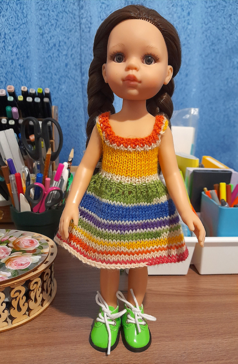 "Прогулки каждой кукле" закончились, подбираемся к финалу и этого челленджа. "Все цвета радуги в одном наряде" это для меня, прежде всего, кукольные одежки, связанные пряжей секционного окрашивания.