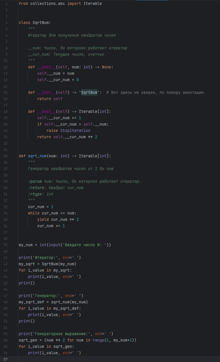 Пользователь вводит число N. Напишите программу, которая генерирует последовательность из квадратов чисел от 1 до N (1 ** 2, 2 ** 2, 3 ** 2 и так далее). Реализацию напишите тремя способами: класс-итератор, функция-генератор и генераторное выражение. Реализуйте функцию gen_files_path, которая рекурсивно проходит по всем каталогам указанной директории (по умолчанию — корневой диск), находит указанный пользователем каталог и генерирует пути всех встреченных файлов. Реализуйте функцию-генератор, которая берёт все питоновские файлы в директории и вычисляет общее количество строк кода, игнорируя пустые строки и строчки комментариев. Реализуйте такую структуру данных без использования стандартных структур Python (list, dict, tuple и прочие) и дополнительных модулей. Для структуры реализуйте следующие методы: Дополнительно: сделайте так, чтобы по списку можно было итерироваться с помощью цикла. Вы работаете в большой компании, которая обслуживает сложную систему торговли. Каждый день генер