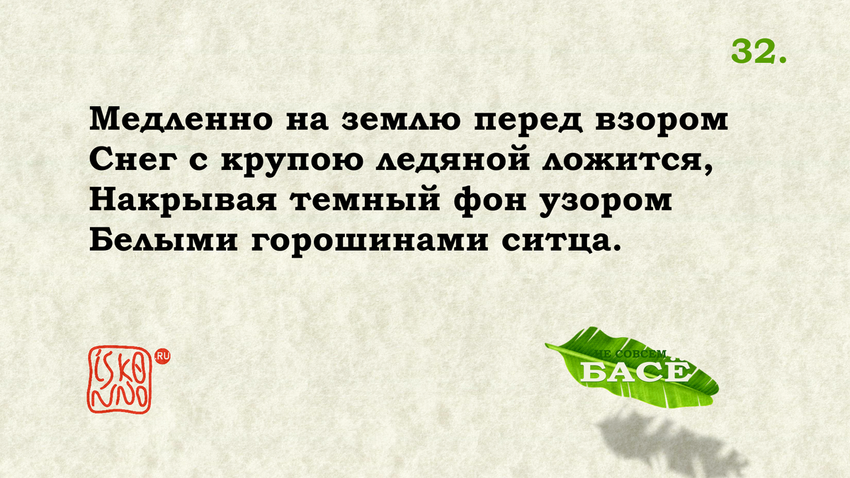 Белыми горошинами ситца. И вновь Басё из озорства смешивает сезоны. Сперва у него идет обычная зима: [арарэ] — это мелкий град, но здесь, скорее, снежная крупа, россыпь льдинок. Лед этот у поэта смешан со снегом... И тут сюрприз: на катабире. Катабира — это такая летняя одежда, тонкий кимоно, а точнее косодэ, кимоно с укороченным рукавом. Ко временам Басё шился из ткани растительного происхождения. Переводчики могут поминать «коноплю» или «крапиву», на самом деле это рами, Boehmeria nivea, по-японски [тёма]. Но это не важно. Важно, что ткань легкая, дышащая, хорошо отводящая влагу. Поэтому катабира из рами стала популярной летней одеждой, носимой без белья, без нижнего слоя. А чтобы в жару катабира лучше охлаждала, на ней, обычно по темному фону изображали что-то прохладное: воду или... да, снег. И последнюю строчку можно перевести одним словом: «...узором»