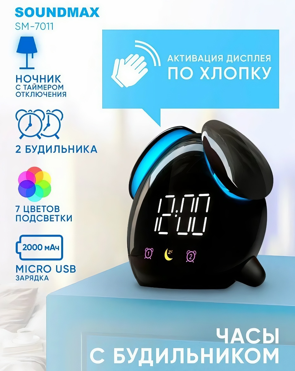 На Ozon нашел Электронный будильник для детей SOUNDMAX SM-7011, ночник, 7 вариантов подсветки.