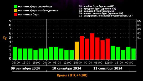 Ученые прогнозируют 10 и 11 сентября 2024 года магнитные бури уровня G1 и G2 (слабые и средние). Ученые Лаборатории солнечной астрономии (ИКИ РАН и ИСЗФ СО РАН) сообщили, что к Земле движется облако плазмы, выброшенное Солнцем 7 сентября 2024 года. Магнитные бури уровня G1 и G2 (слабые и средние) прогнозируются на вечер вторника, 10 сентября (около 19 часов по самарскому времени) С вероятностью около 30% в европейской части страны могут быть полярные сияния. Утром 9 сентября 2024 года произошел еще один выброс солнечных масс по направлению к Земле. Вероятность лобового удара, по оценкам специалистов, составляет более 90%. Приход этого облака размерами около 30 млн километров, движущегося со скоростью около 800 км/с предварительно ожидается в середине дня 11 сентября. Тем временем Самарская область остается во власти мощного антициклона, который медленно перемещается из Предуралья на восток, сообщили синоптики Приволжского УГМС. Как минимум до субботы, 14 сентября, воздух в регионе буде