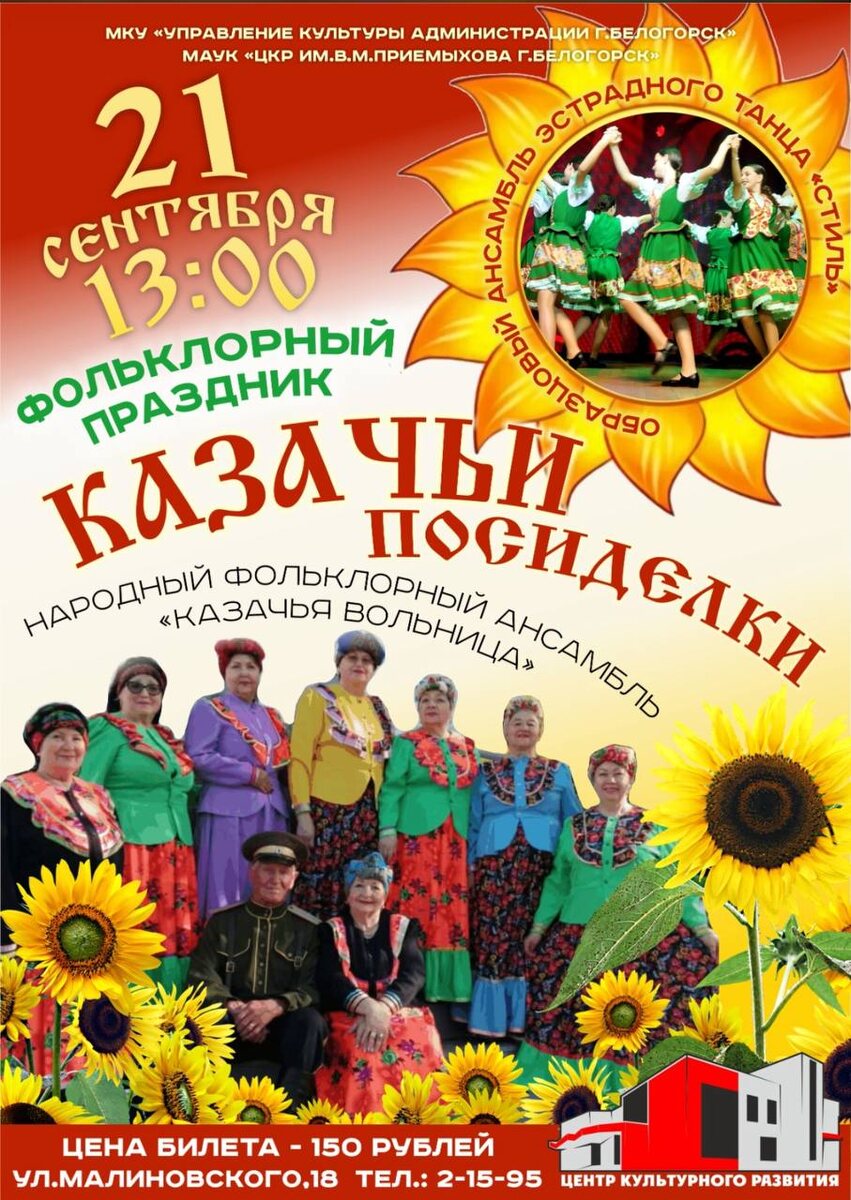 В Белогорске состоится фольклорное мероприятие «Казачьи посиделки». Мероприятие пройдет 21 сентября в Центре культурного развития и начнется в 13:00. Как сообщила начальник Управления культуры Белогорска Оксана Рогозняк, «Казачьи посиделки» представляют собой уникальное народное действо, включающее в себя различные аспекты нематериальной культуры казаков. Гостей ожидают игры, шутки, забавы, танцы, наигрыши и частушки, а также театрализованные сценки из жизни казаков и исполнение песен. Это событие позволит участникам погрузиться в историю и культуру казачьего народа, почувствовать атмосферу традиционного отдыха казаков, узнать интересные факты из их истории. В рамках программы выступят народный фольклорный ансамбль «Казачья вольница» и образцовый ансамбль эстрадного танца «Стиль». Стоимость билета составляет 150 рублей. Для получения дополнительной информации звоните по телефону 84164121595.