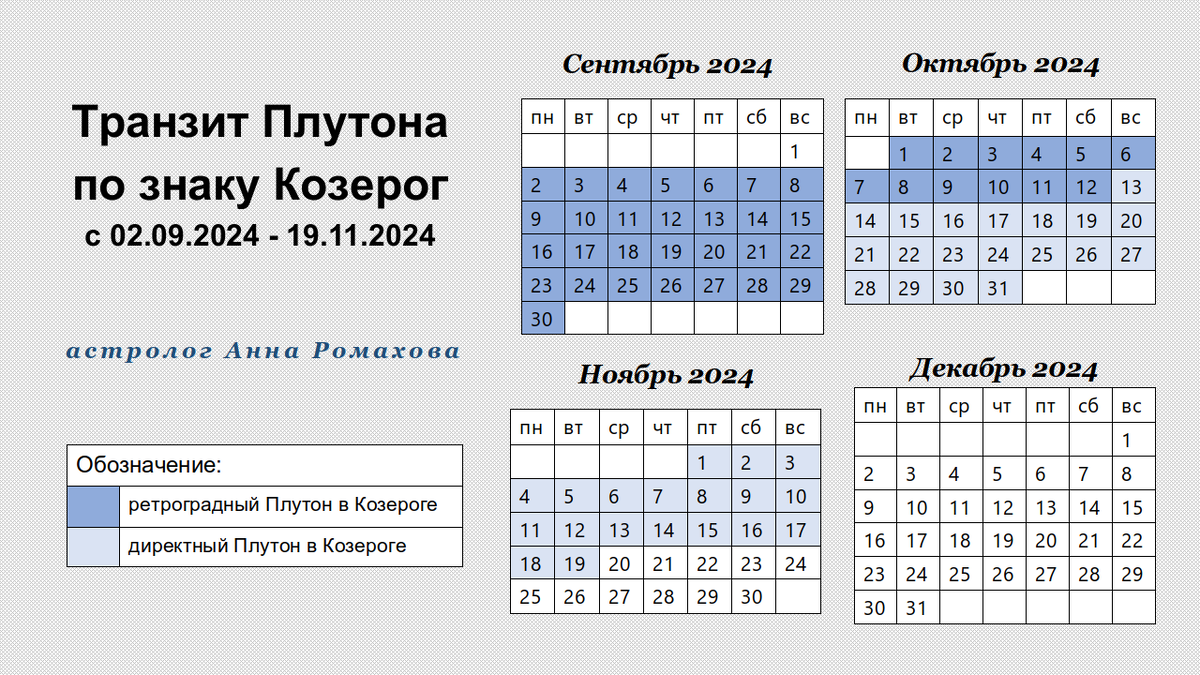 А тем временем Плутон снова вернулся в Козерог 02.09.2024. Все благодаря ретроградности. В Козероге он будет по 19.11.2024 включительно и из всего этого периода по 12.10.2024 ретроградным.