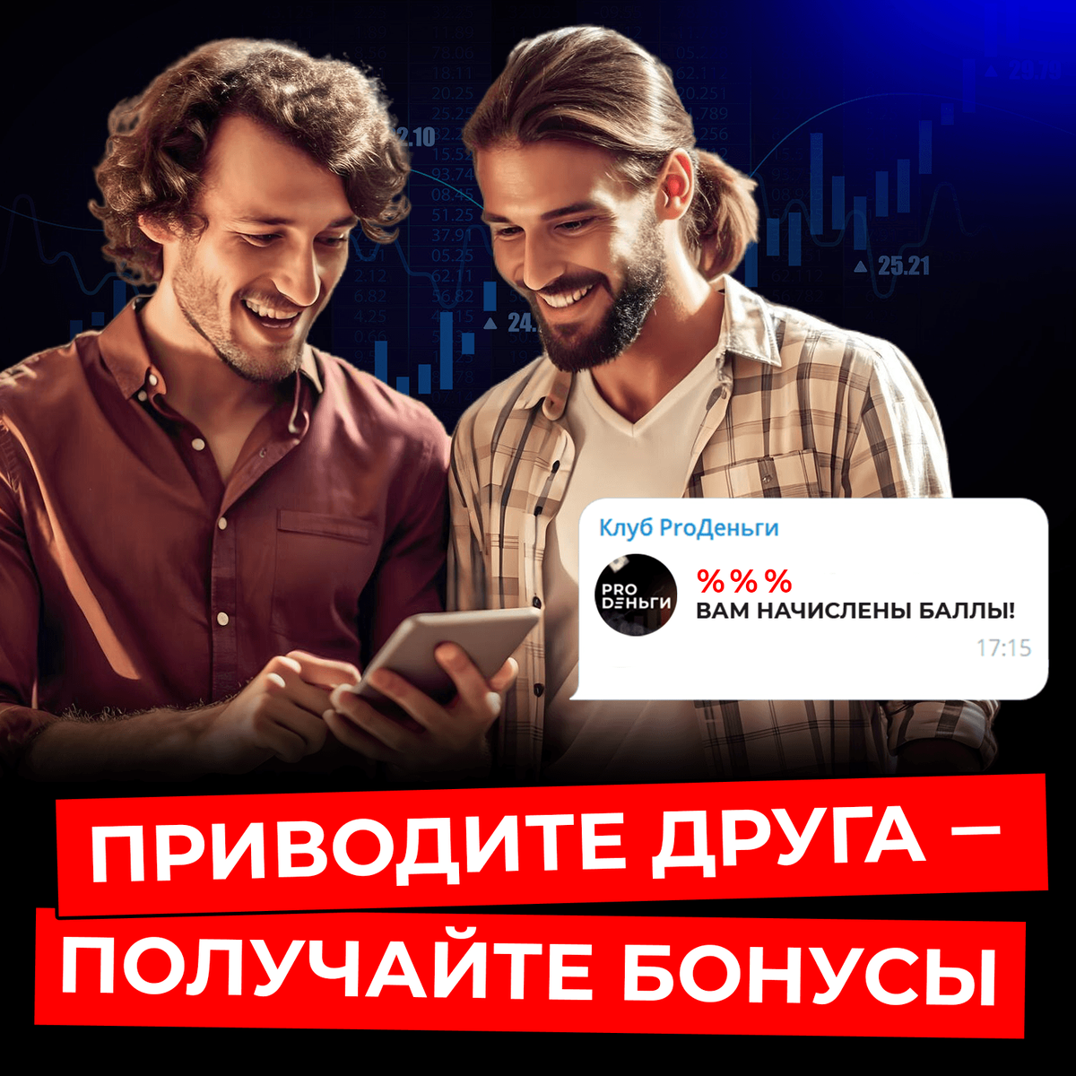 Если вы участник клуба ProДеньги и вам хочется посоветовать продукт своему близкому, сделайте это с пользой для вас обоих — отправьте другу ссылку на оформление подписки. Если друг ею воспользуется, каждый из вас получит бонус. Ваш друг – скидку 50% на подписку клуба навсегда, а вы 50% от всех оплат, произведенных вашим другом. Чтобы вы вместе с другом получили бонусы по партнерской программе, вам нужно отправить другу ссылку, а он должен оформить подписку со скидкой, тем самым выполнив условия начисления вам бонуса. Это обязательные действия. После этого вам начислятся бонусы в вашем личном кабинете нашего бота. Плюсы нашей партнерской программы: 1. Ваш друг получает уникальную скидку на наш продукт, которую нигде больше не получить 2. Вы рекомендуете участие в клубе, который дает огромное количество полезной информации, способной повлиять на успех в инвестициях вашего друга 3. Вы можете приглашать неограниченное количество друзей и знакомых 4. Вы можете этими баллами полн