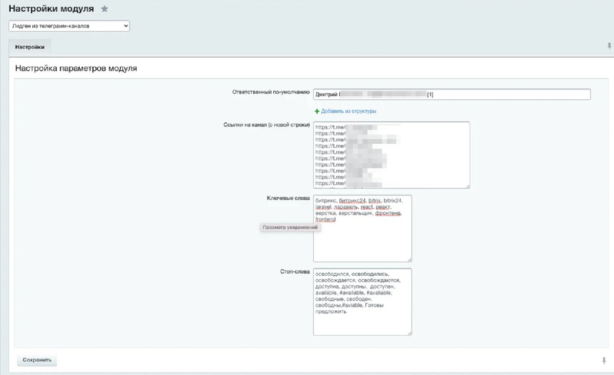 Клиент, заинтересованный в ускорении процесса генерации лидов, искал инструмент для отслеживания активности в Телеграм-каналах с целью выявления потенциальных клиентов. Основная задача состояла в создании системы, которая могла бы анализировать сообщения в этих каналах, определять запросы, соответствующие возможностям компании, идентифицировать подходящие сообщения, формировать на их основе лиды и автоматически интегрировать их в CRM-систему Битрикс24 (коробка). Итак, сначала мы разработали алгоритм взаимодействия модуля с пользователем. Вся работа строится на нескольких основных этапах: 1. Настройка модуля: Пользователь заполняет специальную форму, где указывает необходимые данные. Здесь можно задать: 2. Обработка лидов: Когда модуль находит сообщение, соответствующее заданным условиям, оно автоматически преобразуется в лид. В CRM Битрикс24 передается само сообщение, ссылка на него в чате и ссылка на профиль автора в Телеграме. Лиды создаются автоматически через смарт-процесс, разрабо