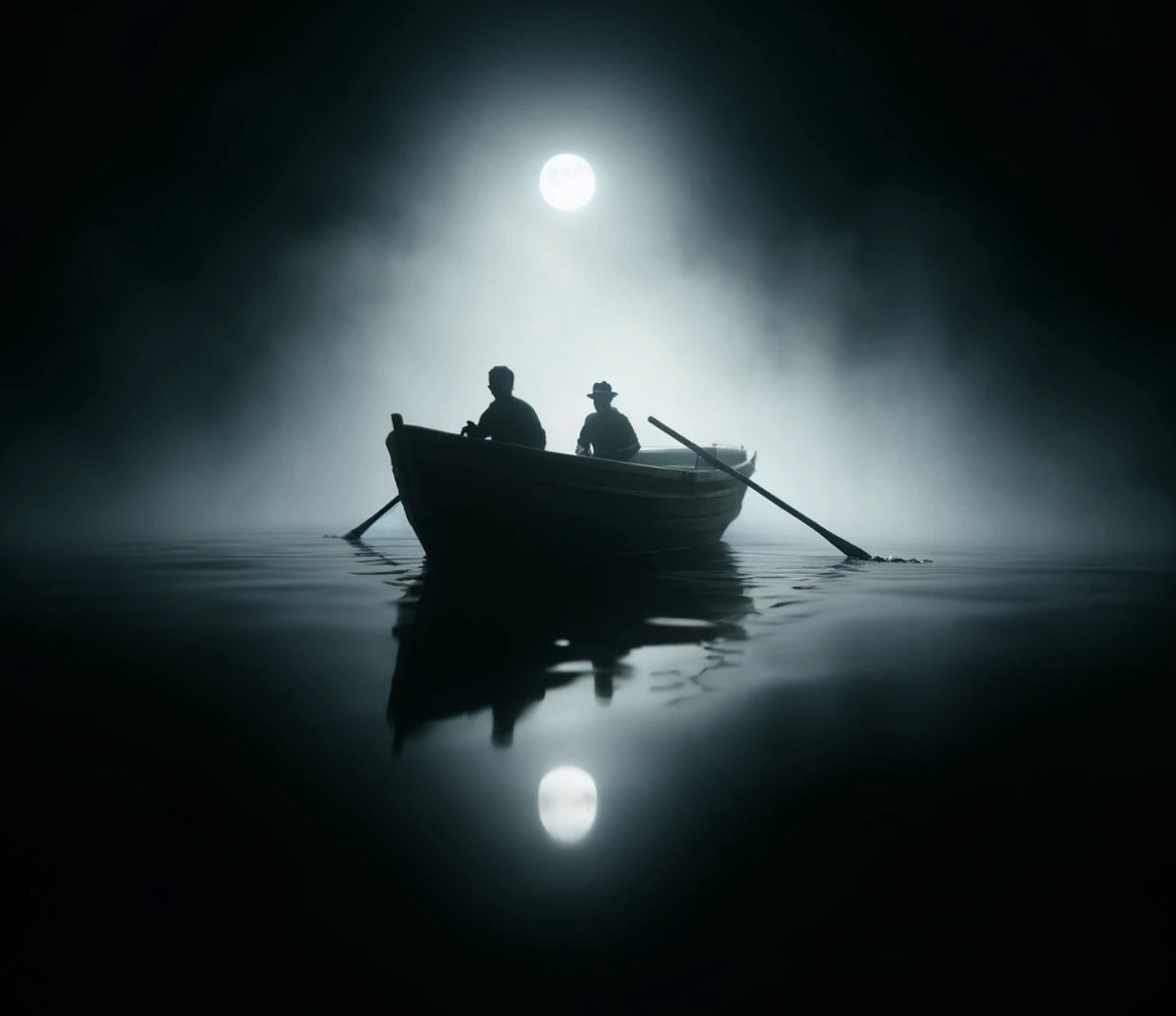 Ночь была темной, а гладь озера казалась черной бездной, скрывающей опасность. Луна едва пробивалась сквозь плотный туман, создавая лишь призрачные отблески на поверхности воды. В этой зловещей тишине, нарушаемой только редким всплесками, двое сидели в небольшой деревянной лодке. Они крепко сжимали весла, готовые начать движение, но страх и неопределенность словно сковали их тела. Сделав усилие над собой они начали грести, пытаясь выбраться из этой густой мглы, но их движения были резкими и не слаженными. Лодка только металась из стороны в сторону. Один пытался ускориться, другой замедлялся, и каждый ощущал, как усилия тратятся впустую, заставляя лодку кружить на месте. Напряжение росло, словно тяжесть, давящая на плечи. Проходило время, но ничего не менялось, и надежда вырваться из этого круга начинала угасать. Лодка, казалось, была обречена на вечное блуждание в этой туманной пустоте. Но в какой-то момент, когда тишина стала невыносимой, один из них, наконец, нарушил молчание. "Дава
