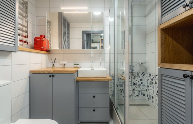 Даже на такой скромной площади удалось уместить все необходимое В этой маленькой студии площадь совмещенного санузла составляет всего 3,5 м. Но дизайнер Полина Дадыко спланировала пространство таким образом, чтобы в нем поместилось все необходимое. Берите на заметку интересные решения! Отделку пола, потолка и стен оставили от застройщика. А чтобы плитка на стенах смотрелась более эстетично, подобрали более контрастную затирку. Унитаз заменили на более современную и стильную модель. Над ним была панель, которая закрывала доступ к коммуникациям. Вместо нее сделали вместительный шкафчик с жалюзийными дверцами, добавив места для хранения. Под раковиной предусмотрели деревянную столешницу и вместительную тумбу с выдвижными ящиками. Рядом, за фасадами такого же цвета, скрыли стиральную машинку с функцией сушки. В зеркальном шкафу есть полки для хранения косметики и аксессуаров для ванны. Функциональное решение — подсветка над дверцей, которая позволяет видеть все содержимое шкафчика. Ванну о
