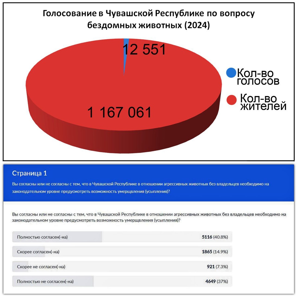 НА ЭТОТ РАЗ – ЧУВАШИЯ Нами был проведён статистический анализ результатов очередного голосования по вопросу бездомных животных. На этот раз в Чувашии (2024). В очередной раз результат весьма неприятный для сторонников жестоких методов обращения с животными. Для составления статистики голосования, было рассчитано количество голосовавших по дням. Доверительный интервал голосования составляет: - 12 551 человек (всего проголосовавших) из 1 167 061 человек (всего жителей Чувашской республики). Что составляет около 1,075% от количества жителей Чувашской республики. Соответственно, относительная неопределённость достигает 98,925%. Нами была взята общая выборка голосов, а также отдельные выборки по негативному, скорее негативному, скорее положительному и положительному мнениям относительно животных без владельцев. Среднее значение голосов в день составило 71/116/42/21/107 соответственно, при статистической неопределённости 105/142/73/32/108 соответственно. Данные соотношения указывают на