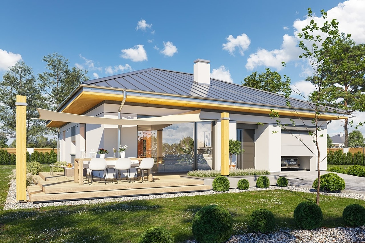 Представляем проект одноэтажного дома на одну семью. Весь функционал расположен на одном этаже. Дом построен прямоугольной формы, покрыт многоскатной крышей. Полезная площадь составляет около 113 м2 и обеспечивает комфортные условия проживания для семьи из 3-4 человек. Архитектура проекта
