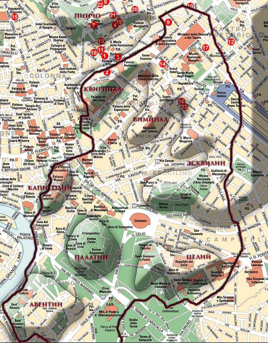 Поиски в интернете карты современного Рима с границами семи главных холмов не дали никакого сносного результата. Пришлось воспользоваться Фотошопом и совместить две карты — города и холмов. Получилось как-то так: Скачать файл размером 2362х3030 px в формате jpeg можно здесь.
