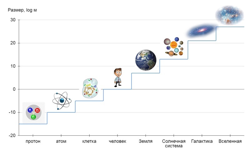 Продолжаем размышлять о подъёме сознания по ступеням мироздания. Общая концепция и размышления о стадии разумной Земли были тут и тут. Если коротко, мы наблюдаем во Вселенной несколько характерных масштабов: элементарная частица (протон), атом, клетка, многоклеточное существо, планета, планетная система, галактика и собственно Вселенная. Размер объекта каждого следующего уровня относится к размеру объекта предыдущего уровня примерно как 100000:1: атом в 100 тыс. раз больше протона, клетка в 100 тыс. раз больше атома, человек в 100 тыс. раз больше клетки и т.д. Пропорция 10^5 не всегда выдерживается строго, но, с другой стороны, есть и приличный разброс в размерах самих объектов. Если нанести их характерные размеры на график в логарифмическом масштабе, то они почти лягут на прямую, которую я в полушутку назвал «лестницей Иакова». Почему «лестницей Иакова»? Потому что в библейской истории эта лестница соединяла земной мир и небесный: