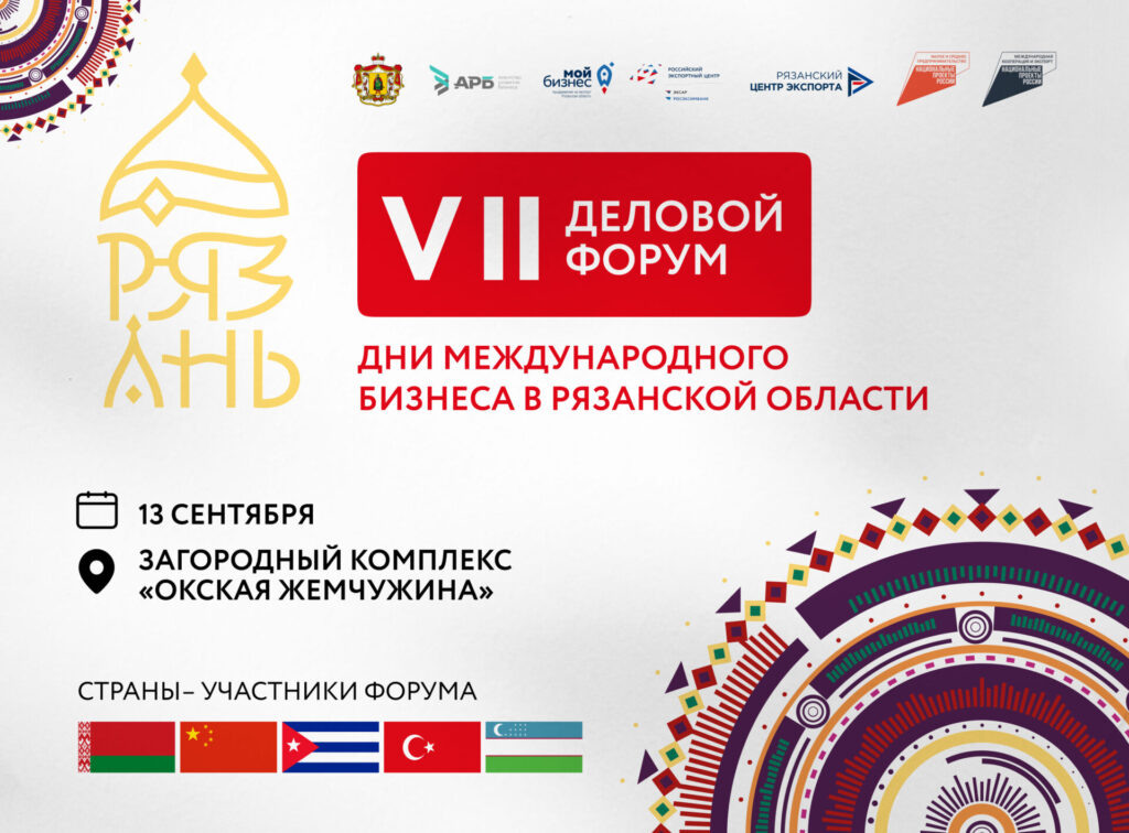 VII Деловой форум «Дни международного бизнеса в Рязанской области» пройдет 13 сентября на территории загородного комплекса «Окская жемчужина». Форум ― крупнейшее международное мероприятие региона в экономической сфере. Его темами традиционно станут обсуждение вопросов развития экспорта, совершенствования механизмов комплексной поддержки бизнеса при выходе на зарубежные рынки и координации различных институтов развития. Организатором мероприятия выступает Агентство развития бизнеса Рязанской области при поддержке правительства Рязанской области. В форуме примут участие представители бизнеса, исполнительной власти, инфраструктуры поддержки предпринимателей, международных сообществ и организаций из России и зарубежных стран. В числе гостей в этом году — участники из Белоруссии, Китая, Кубы, Турции, Казахстана, Узбекистана. В программе: ▪️ пленарная и панельные сессии; ▪️ «круглые столы» по цифровым решениям в экспорте; ▪️ мастер-классы по работе с китайскими и турецкими партнерами; ▪️ наг
