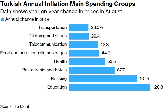 Повышение процентных ставок замедляет совокупный спрос, а за ним и инфляцию, которая ранее превышала 70% Годовая инфляция в Турции резко снизилась в августе, поскольку 50%-ная стоимость заимствований отражается на экономике и снижает спрос. Рост цен замедлился до 52% в годовом исчислении с 62% в предыдущем месяце, показали данные государственного статистического управления во вторник. Это совпало с прогнозами аналитиков, согласно опросу Bloomberg. Хотя данные свидетельствуют о том, что высокие процентные ставки начинают замедлять один из самых высоких в мире уровней инфляции, последний показатель все еще более чем в 10 раз превышает официальный целевой уровень центрального банка. Снижение также частично объясняется эффектом базы, поскольку в 2023 году показатели резко возросли. Чиновники намерены снизить инфляцию до 38% к концу года, хотя большинство экономистов считают, что она будет ближе к 42%, верхней границе диапазона прогнозов центрального банка. Центральный банк также уделяет бо
