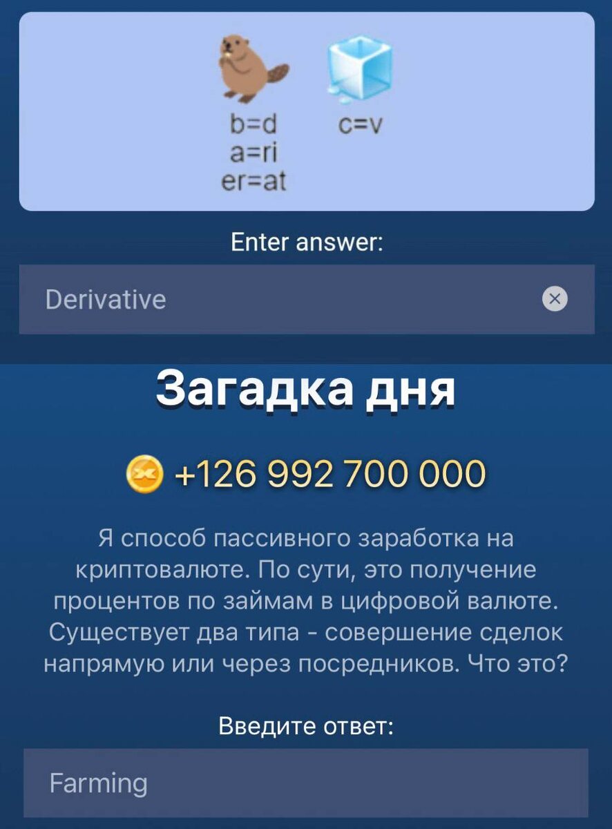 Загадка дня 3 сентября X Empire Ответ: Farming ✔️ Ребус: Derivative 🪙 Видео Спутник - 1 Видео БУТЕРИН - 6 Видео П.Дуров - 35 Видео Трамп - 2007 Видео Безос - 0 Эпизод 24 - 39024 Эпизод 25 - 34425 Эпизод 26 - 39326 Эпизод 27 - 35527 Эпизод 28 - 75928 Эпизод 29 - 34329 Эпизод 30 - 64930 Эпизод- 31- 61931 Эпизод 32: 12932 Эпизод 33- 86133 Эпизод 34 - 1958