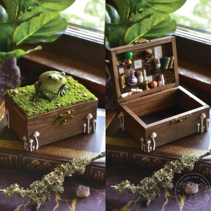 Все произошло случайно) На одном известном всем сайте, я увидела просто потрясающие шкатулки, которые и снаружи прекрасны, а внутри так ещё лучше. Снаружи они украшались какими-нибудь фигурками, а внутри были полны всяческих книг, свитков и разных магических атрибутов. Я тогда подумала: о боже, как было бы здорово иметь дома такую штучку, наверное, когда-нибудь решусь такую сделать! Но ведь у меня нет совершенно времени на такое количество лепки и создание всех этих прекрасных вещиц.. И тут, знаете, вот бывает в сериалах, так показывают, когда человек упорно не замечает чего-то, а потом идёт мимо и такой: О да, вот же оно! Я шла мимо принтеров... И тут я подумала, а почему, собственно, я не могу найти подходящие модели, распечатать, потом раскрасить? Дополню свитками, дополню кристаллами и всем, что смогу сделать сама. Так что я заказала основы шкатулки и начала готовиться)) Шкатулки я покрываю сначала морилкой, пока у меня только 2 цвета. Ну технически их 3: чёрный, папоротник и ор