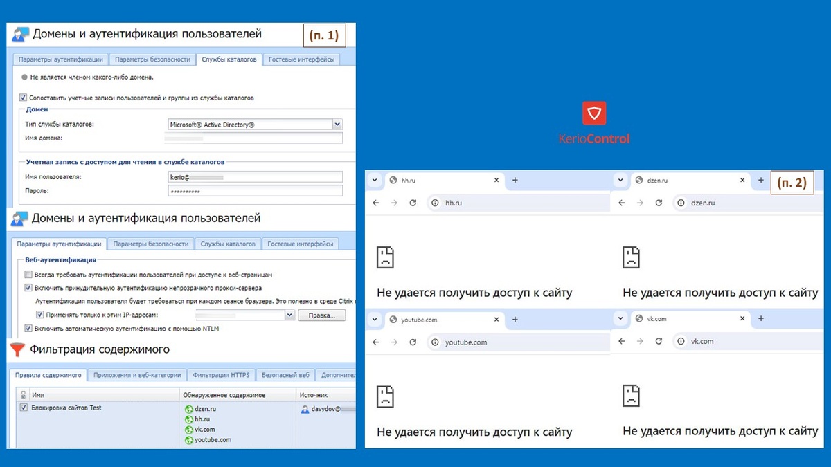 С помощью Kerio Control настроили фильтр, блокирующий доступ к нежелательным ресурсам (социальные сети, развлекательные сайты и другие веб-ресурсы, не связанные с рабочими обязанностями).