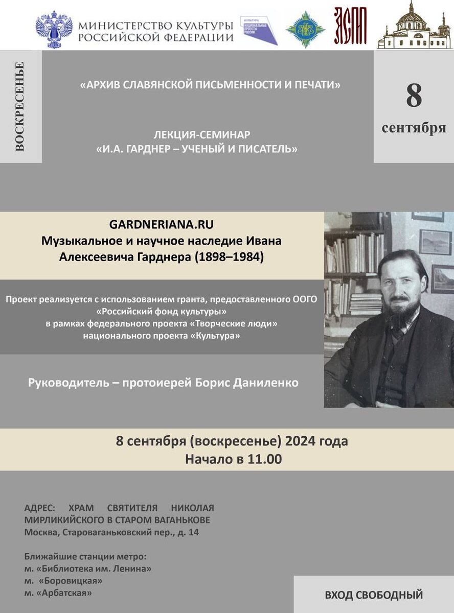 Дорогие друзья! Приглашаем на лекцию-семинар «И.А.Гарднер - ученый и писатель». Иван Алексеевич Гарднер (Севастополь, 1898 - Мюнхен, 1984) - ученый, композитор, мемуарист; потомок двух старинных родов Гарднеров и Львовых. Родился в Севастополе, рос и учился в Москве; в годы предреволюционного лихолетья оказался в Крыму, откуда в ноябре 1920 г., покинув родные берега на борту линкора «Генерал Алексеев», начал свою странническую эпопею. Османская империя, Королевство Греция, Болгарское царство, Королевство сербов, хорватов и словенцев, Чехословакия, Палестина, Австрия и Германия стали не только местами его пребывания на протяжении всей жизни, но и связали его многостороннюю деятельность с укоренением в этих странах культуры русского зарубежья. Его наследие представляет огромный интерес как в культурном (русская музыкальная жизнь в зарубежье ХХ в.), так и научном (история церковной музыки славяно-византийской богослужебной традиции) отношениях. #Российскийфондкультуры #Нацпроекткульт