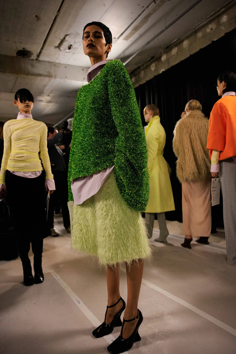 Ткани, сшитые по индивидуальному заказу, будут встречаться повсеместно, поскольку стиль lady like и эстетика Officecore продолжат создавать модные истории. Наиболее представительными оттенками станут серый, хаки и чёрный — более приземлённые цвета, которые можно сочетать с яркими акцентами.
