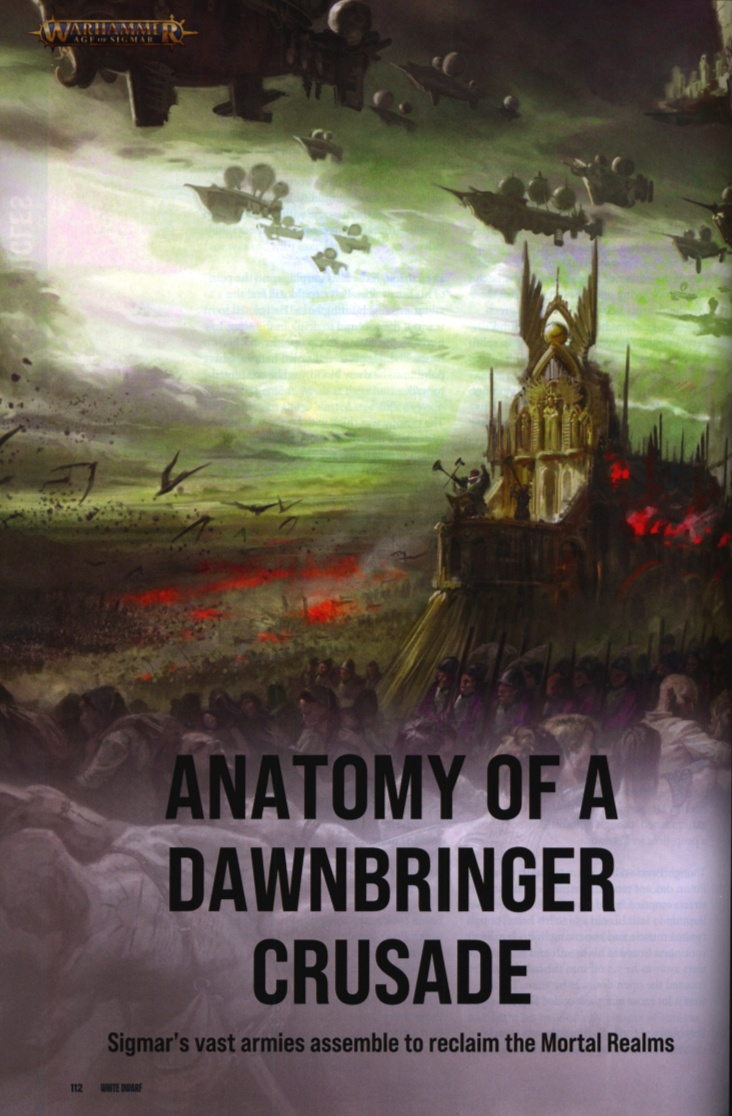 Рассветоностные Походы – это символ могущества Бога-Короля, а также маяк надежды для всех тех, кто жаждет увидеть возрождение славы Эпохи Мифов. Под священным Знаменем Геральдор, шеренга за шеренгой идут тяжеловооруженные пехотинцы, хрипло распевая маршевые песни, продвигаясь все глубже на вражескую территорию. За ними следует извивающаяся колонна, состоящая из боевых машин, телег с припасами, мобильных святилищ и сотен других жизненно важных вещей. Это армии, созданные для полностью автономного и самостоятельного выживания в походах по маниакально жаждущим смертных душ землям. Они перевозят источники магической энергии и живительные металиты, которые лягут в основу нового оплота Порядка.