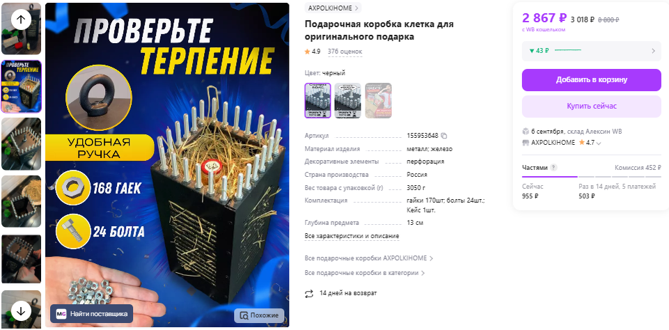 Если бы мне подарили подарок в такой коробке, то я бы его оставила до лучших времен. 168 гаек и 24 болта - вот это люди заморочились. Проще распилить пополам, чем открыть. Только представьте лицо человека, который всё это открутит и увидит, что внутри его ожидала какая-нибудь безделушка…