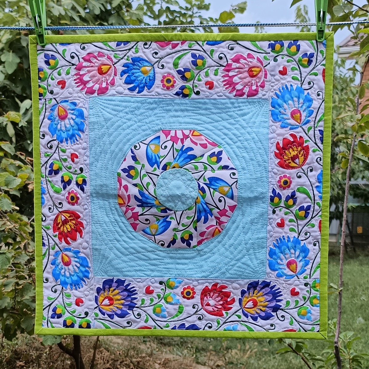 Всем привет! Сегодня у меня #лоскутныехвАстики. Сшила наволочку 40*40 см, в комплект к большой в технике "калейдоскоп", которую подарила маме. Малышка была импровизацией из треугольников оставшихся с "калейдоскопа". Стёжка тоже подбиралась по ходу дела. Центр стегала на обычном ходу, а на цветочных краях потренировалась в СХС. #пэчворк #лоскутноешитье #рукоделие