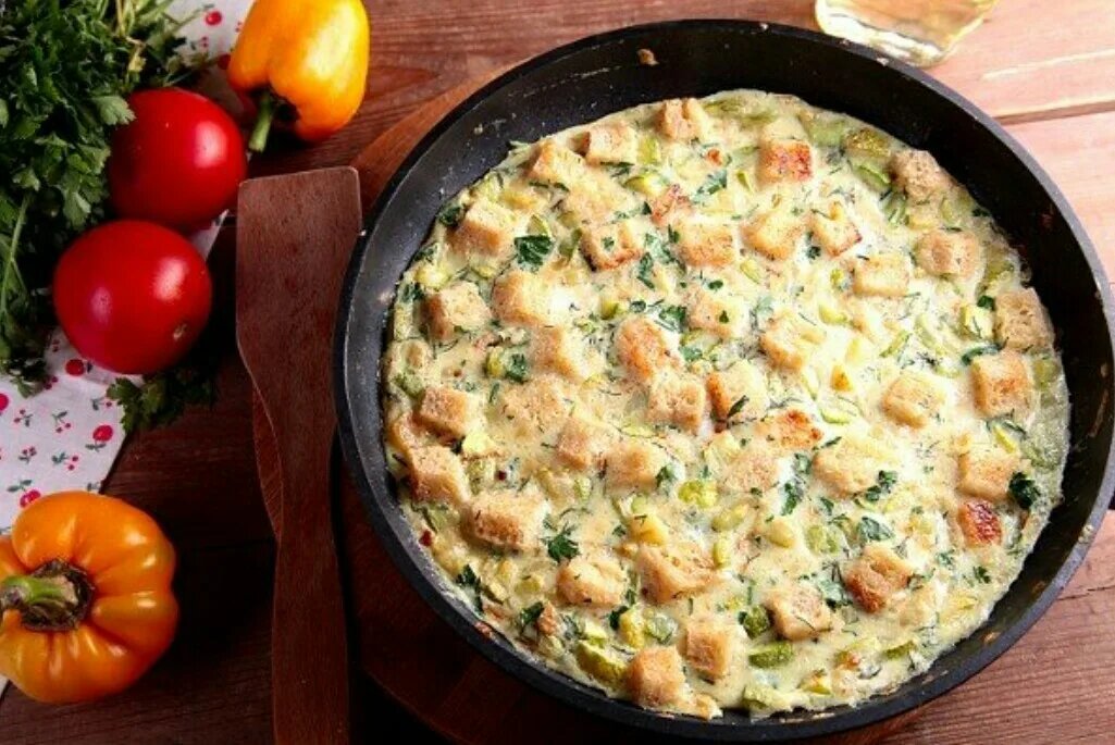 Ингредиенты: 1. 3 яйца 2. белый нарезанный на кубики хлеб 3. 1 очищенный и мелко нарезанный томат 4. соль и перец по вкусу 5. щепотка укропа или любой другой зелени 6. сыр примерно 20г Процесс готовки: 1. разбиваем яйца в удобную миску, размешиваем до однородной массы, добавляем заранее мелко нарезанный томат, соль и перец 2. смазываем сковородку маслом и выливаем получившиеся смесь на разогретую сковороду 3. аккуратно выкладываем заранее нарезанный хлеб и жарим с каждой стороны по 5 минут на медленном огне 4. сверху посыпаем зеленью и все готово и натираем сыр на всю площадь яичницы ровным слоем Итог: у нас получается сочная, сырная яичница с поджаренными до золотистости, хрустящими кусочками хлеба ! Всем приятного аппетита!