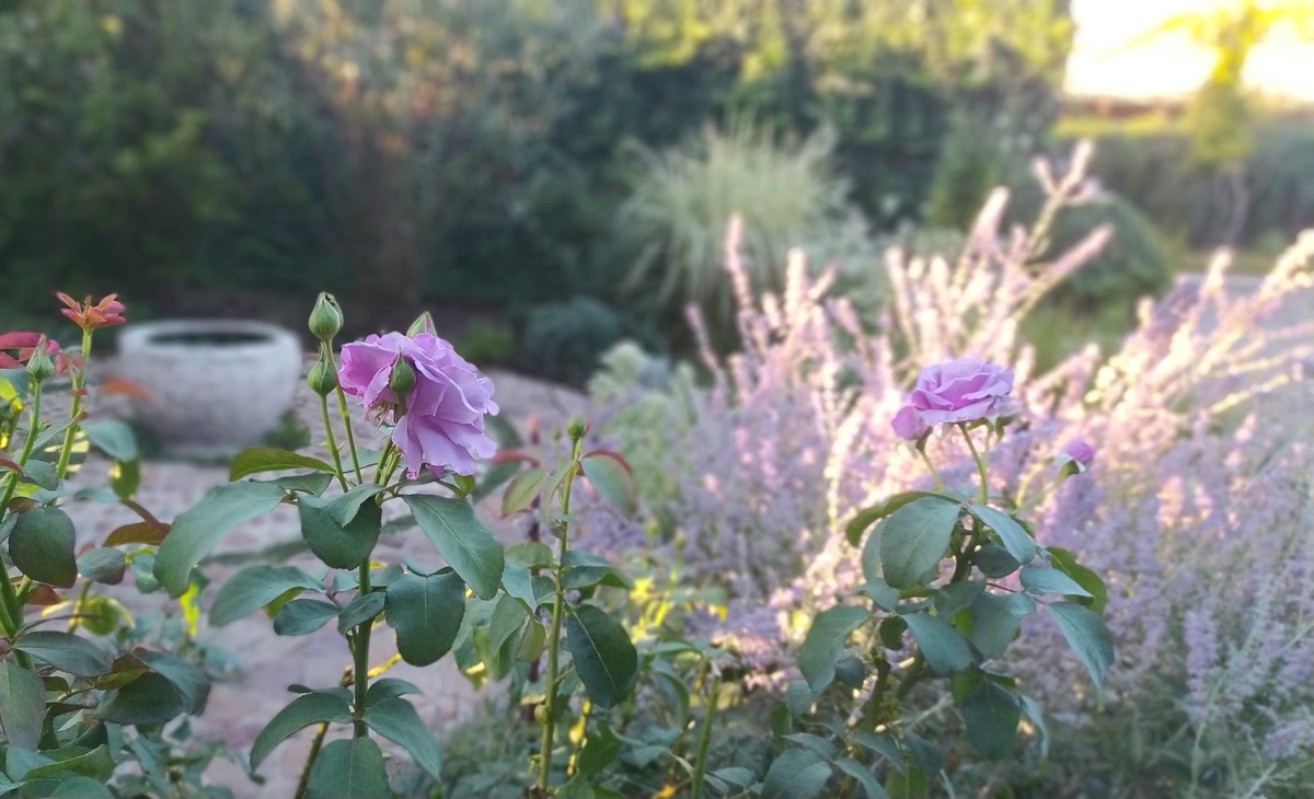 По обе стороны розу окутывают голубые облака из перовскии: еще в прошлом году здесь было всего одно, но осенью рядом с ним я обнаружила новоявленный кусточек и отсадила его для баланса с противоположной стороны розы. Кстати: у первого куста снова образовалась новая деленка. Отправлю ее в зону лаундж у каменной скамьи. Перовския - просто необходимый компонент в южном саду: довольствуется минимальным, а отдача от нее - максимальная. Цветет все лето, и большую часть осени, безо всяких капризов и фокусов. Я уже достаточно выросла, чтобы это оценить и заполнять сад именно такими растениями, а не множить пестроту новыми видами.
