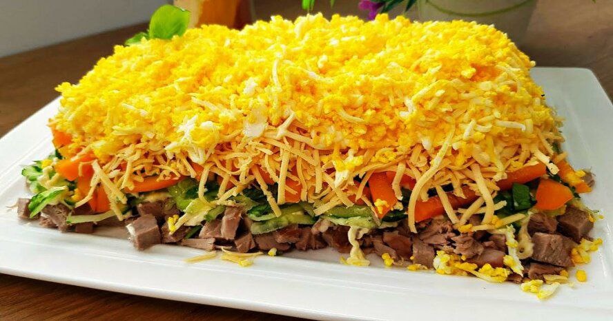 Потрясающе вкусный салат «Идеал» намного круче оливье. Мясной салат на праздник и не только Салат получается сытным, за счет свежих овощей, еще и полезным. Для приготовления вам потребуются такие ингредиенты: — мясо, 300 г; — перец болгарский, 1 шт; — огурец, 2 шт; — сыр твердый, 100 г; — яйца, 3 шт; — зелень по вкусу; — соль и перец, майонез по вкусу. ❗❗Мясо берите любое, отварите его со специями и солью лавровым листом. Огурец трем на крупной терке и отжимаем сок. Первый слой – мясо и делаем решетку майонезом. Второй слой – огурец, солим и посыпаем зеленью по вашему вкусу. Делаем тонкую сеточку из майонеза. Выкладываем кусочки сладкого перца, решетка из майонеза. Посыпаем тертым на крупной терке белком, делаем сеточку из майонеза и посыпаем салат тертым на мелкой терке желтком. Ставим на пару часов в холодильник и подаем к столу. Такой салат вы можете сделать, как на блюде, так и в салатнике или в кольце, если хотите порадовать гостей за праздничным столом.