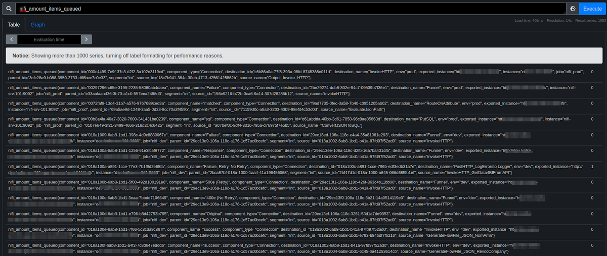 Итак, нам необходима метрика nifi_amount_items_queued, и если в prometheus сделать запрос этой метрики, то мы увидим большое количество данных со значениями 0