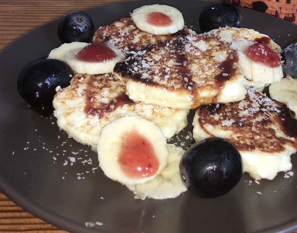 Сырники: 180 гр. творога 0%, 1 яйцо, 20 гр. муки, сахзам по вкусу, ванилин. Смешиваем все ингредиенты и лепим шарики. Жарим на а/п сковороде, смазанной кокосовым или любым другим маслом. Украшаем фруктами и т.д. Bon Appetite!