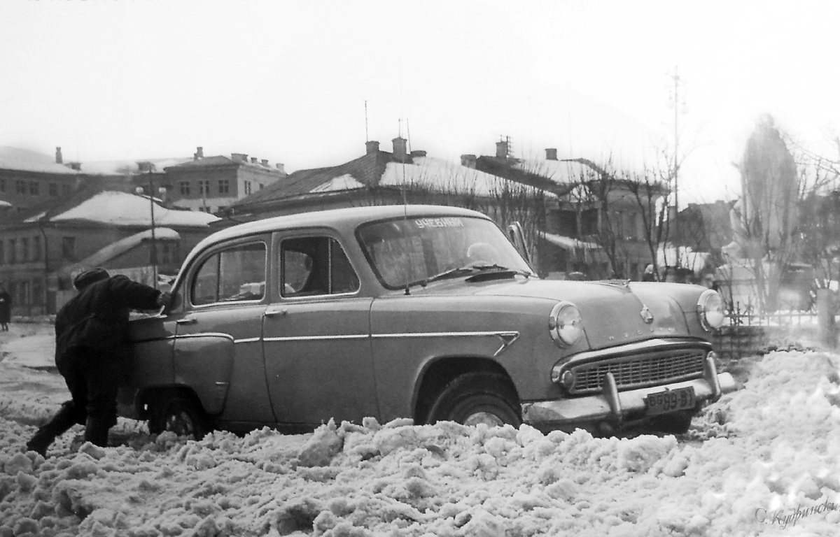 Зимние приключения в центре Вологды, 1962 год Бедолага пытается вызволить машину из западни ни где-нибудь, а в самом центре города. Это улица Мира у перекрёстка с улицами Урицкого и Клары Цеткин. Сейчас это Козлёнская и Благовещенская соответственно. Там, где стоят деревянные дома, к 1970-м будет построено здание УМВД, а чуть правее потом появится "Дом быта". Так же справа можно видеть скульптуру военного, которая стояла в начале аллеи на улице Мира.