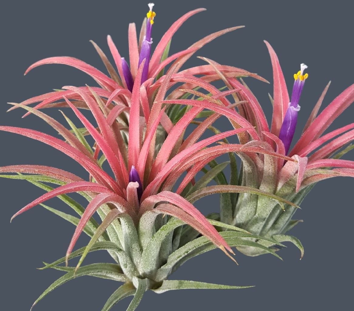 1. Тилландсия Ионанта. Популярный и распространенный вид тилландсии, который отличается красочными листьями и яркими цветками. Листовые пластины могут быть красными, оранжевыми, зелёными и пурпурными. На их поверхности часто присутствуют полосы или пятна. Листья образуют достаточно плотную розетку, достигающую 20-35 см в высоту. Цветки могут быть ярко синими, фиолетовыми или розовыми. Они появляются на высоком цветоносе. 2. Тилландсия Голова медузы. У растения плоские, изогнутые и вьющиеся листья, которые создают впечатление медузы, свисающие с опоры. Листья обычно имеют серебристый, серо-зелёный или голубоватый оттенок. У взрослого растения летом появляется цветонос. 3. Тилландсия Дуера. У растения пёстрое необычное соцветие. Оно напоминает акациевый лист в ярко-оранжевом цвете. Листья узкие и длинные, языковидные. Они формируют плотно собранную розетку, из которой вырастает длинный цветонос. 4. Тилландсия Адриана. Листья мягкие, тонкие и пушистые. У них зелёный или серебристый о