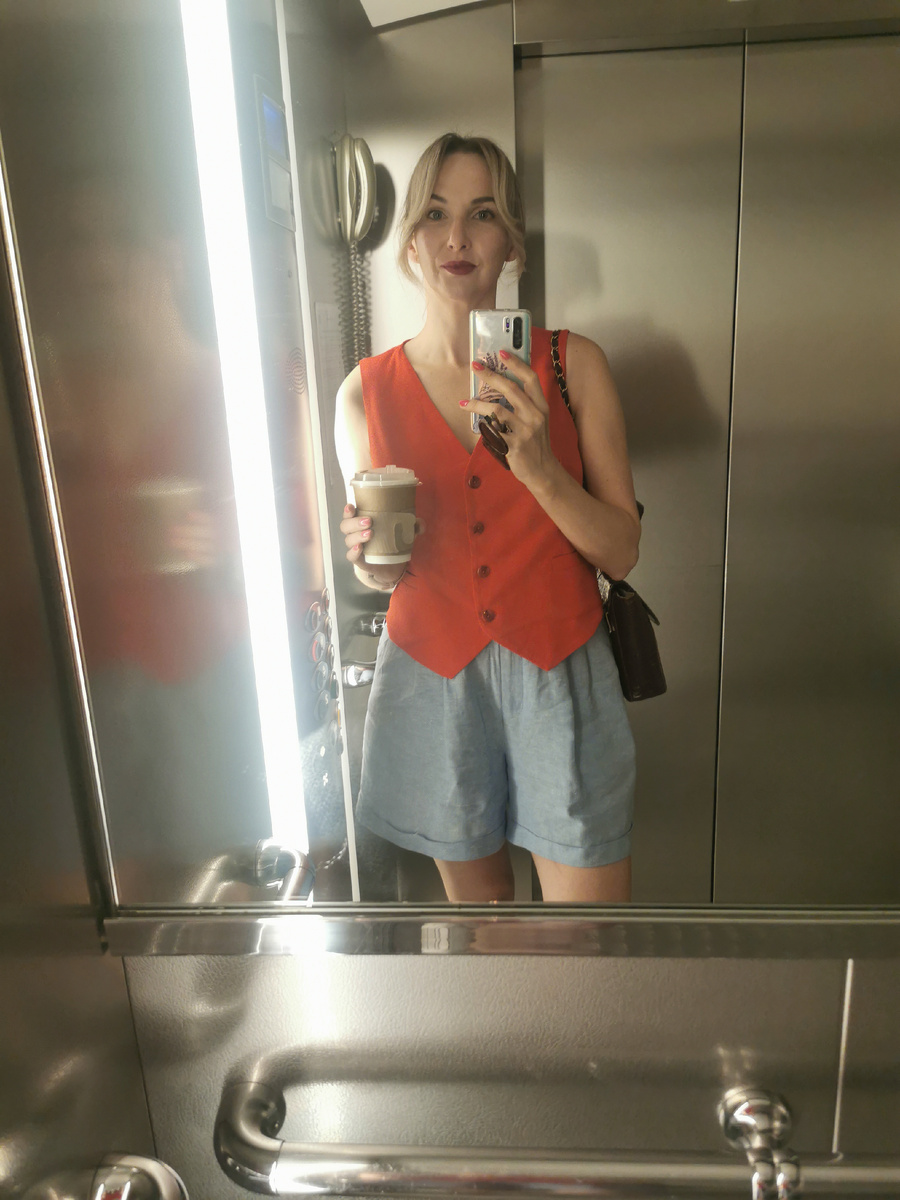 В офисе, кстати, для приличия, все-таки пиджак накинула на свой наряд. Ну и не только для приличия, на улице жарко, кондиционеры в помещении дубасят, прям в макушку. Некомфортно голым плечам.