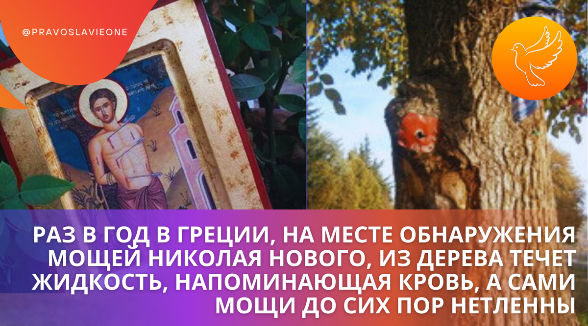 В наши дни в поселке Вунена (Греция), на месте казни святого Николая Нового, происходит чудо, подобного которому нет больше нигде на земле. Как написано в житии, Николая бичевали на этом месте до тех пор, пока земля не стала багровой от крови, а потом – привязали мученика к дереву и метали в него стрелы и копья, пока он не истек кровью. И каждый год в день мученической кончины святого здесь «кровоточат» деревья, источая темную жидкость, которая имеет особые свойства.