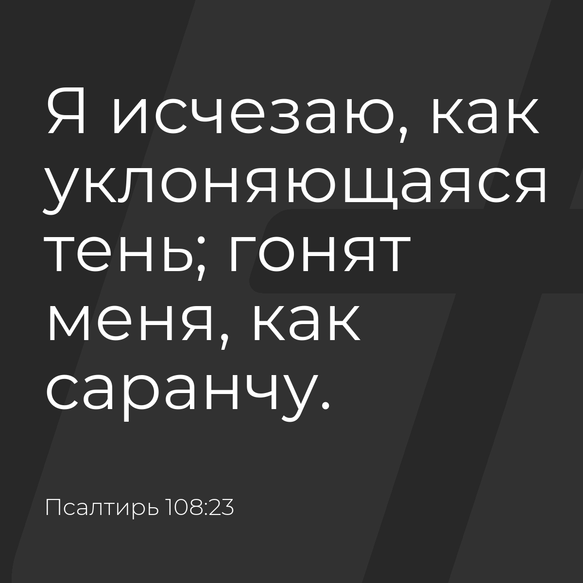 «Со мною же, Господи, Господи, твори ради имени Твоего. Спаси меня, ибо я беден и нищ, и сердце мое уязвлено во мне. Я исчезаю, как уклоняющаяся тень; гонят меня, как саранчу. Колени мои изнемогли от поста, и тело мое лишилось тука. Я стал для них посмешищем: увидев меня, кивают головами своими» (ст. 21-25).