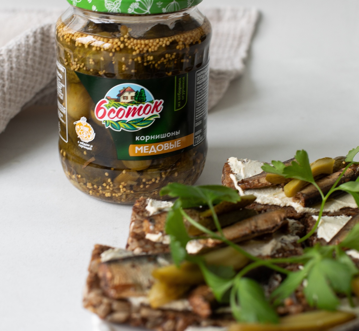 - Выкладываем творожную массу на хлеб, сверху - шпроты и медовый корнишон.
