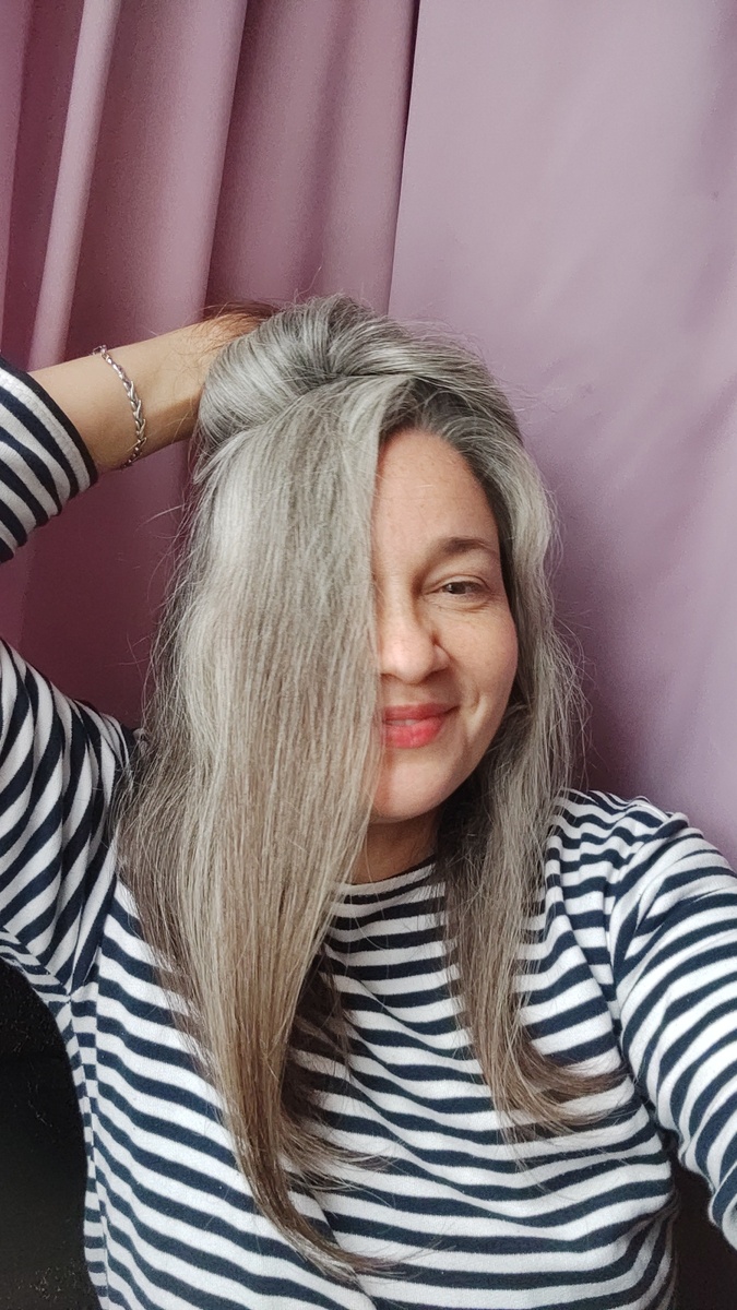 Закрасить, проблема - но в этом есть белый плюс! Теперь понимаю противников седины и людей, которым не приятно на неё смотреть, они видят седину не в деле, а чаще короткие отрастающие корни или просто стриженную на голове - где ж ей раскрыться и показать себя?! Не где! Люди быстро живут, быстро поседели, быстро закрасили или просто состриглись и хватит мучений с волосами. Всех понимаю. Сама была в первом случае, когда быстро красила и лишь бы не видеть... Лишь бы скорее закрыть позор отражающих корней. И только, когда позволила серебру расти в полном соку, быть, а не прятаться, я поняла, что пряди моделируют полотно. По этому оно уникально у всех. Седые, белые пряди разные, поэтому и цвет получается не стандартный, а индивидуальный. Ну, знаете, сегодня колорист намешал кисточкой три тюбика и говорит, это тренд и всё проглотили. Бегают к нему, лишь бы на тренд нарваться! А ему хорошо, деньги идут сами. Но природа умнее! Она не истощает человеческий ресурс, она его наоборо