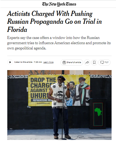 И вот никакая это вовсе и не шутка. На полном серьёзе истерику закатила Нью-Йорк Таймс. И, что характерно - где хвалёная толерантность, где представители движения БЛМ, в конце концов? Но, почитаешь - аж жуть берёт... Активисты, обвиняемые в распространении российской пропаганды, предстанут перед судом во Флориде Эксперты утверждают, что это дело дает представление о том, как российское правительство пытается повлиять на американские выборы и продвигать собственную геополитическую повестку дня. Необычный судебный процесс, начавшийся во вторник в Тампе, штат Флорида, затронул кандидатов на местные выборные должности. Однако эксперты утверждают, что это дает редкую возможность увидеть, как Россия на протяжении десятилетий пыталась тайно влиять на американскую политику. Прокуроры говорят, что Россия, относительно несложным способом, нашла сочувствующую группу в Соединенных Штатах, пригласила ее лидера посетить Москву и установила долгосрочные отношения посредством звонков, электронной почт