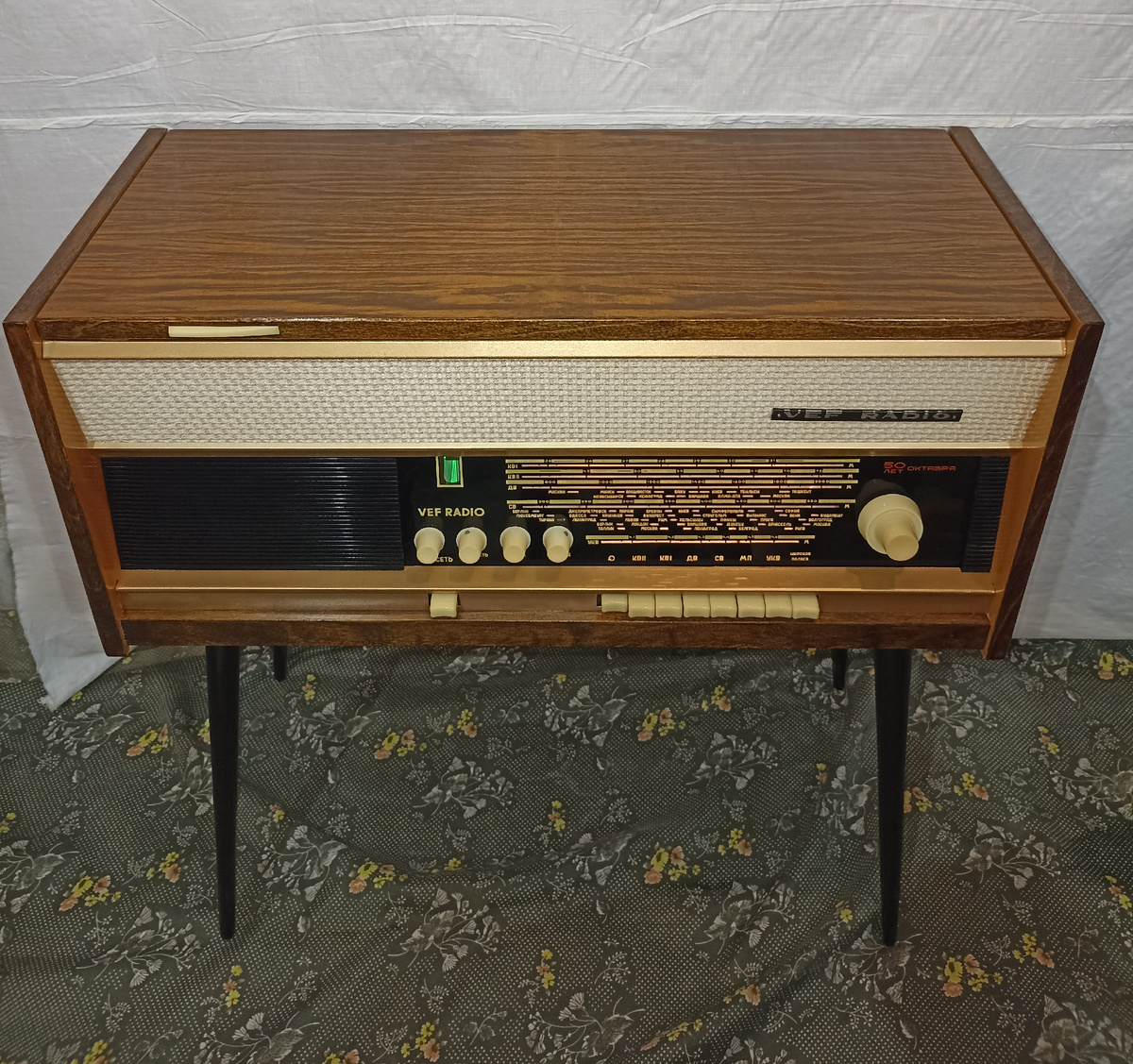 КРАСНОЯРСК, Россия - 04.09.2024. Друзья, завершили очередной проект по реставрации. Сегодня пойдет речь о знакомой нам, по предыдущим публикациям, радиоле VEF Radio. Год выпуска - 1967 - Юбилейная серия - 50лет Октября, о чем свидетельствуют большинство деталей внутри радиолы (достаточно достоверный способ установить год выпуска) и не броская, но очень красивая надпись в правом углу шкалы. Надпись выполнена алой краской, при включенной подсветке шкалы имеет красное свечение. Сохранность радиолы была очень хорошая, поэтому было принято решение сохранить максимально возможно оригинальное исполнение. Корпус отделан специальным покрытием имитирующим шпон и покрыто глянцевым лаком. За данное решение, в свое время сотрудники получили государственную премию. Благодаря чему технологический процесс был значительно упрощен, при сохранении потребительских качеств футляра (корпуса). Торцы покрыты шпоном, были тонированы и покрыты лаком, мы воспроизвели все эти этапы с сохранением цвета - результ
