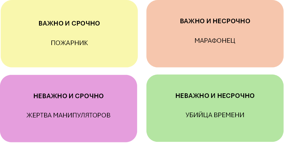 Если взять все туже матрицу Эйзенхауэра, то я бы выделила следующие стили управления временем в компаниях: