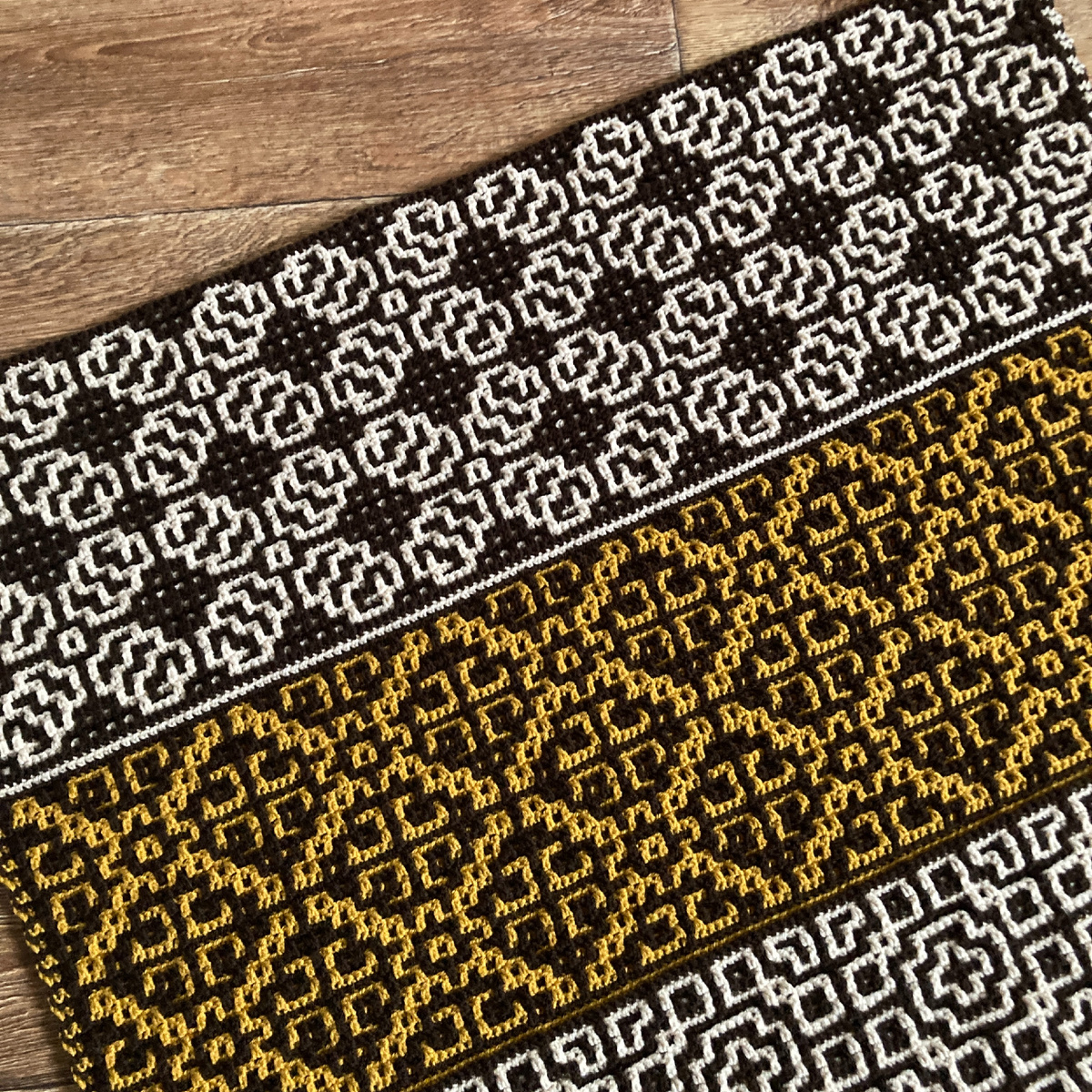 и схема для квадратного мотива размером 25 рядов. Готова ещё одна полоса прямого пледа в мозаичной технике вязания крючком. Решила всё-таки полосы вязать по цвету всего в двух вариантах: фон везде темно-коричневый, а узоры - желтый цвет и светло-бежевый. Хотела в последующих полосах применить принцип инверсии цвета или добавить третий вариант полосы - бежево-жёлтый, но мне не понравилось, ни то, ни другое. Узоры основные теряются, а фоновые узоры мне не приглянулись. Даже начала вязать бежево-жёлтую полосу, но пришлось распустить, совершенно не вписалась в общее полотно, да и сама по себе получилась какая-то совсем не выразительная. Но зато на всех полосах будут разные орнаменты, вяжу по два раппорта в высоту, шесть - в ширину, получается, на мой взгляд, довольно гармонично. Надеюсь, что полностью плед будет смотреться не хуже, чем сейчас. Прямая схема для четвёртого узора, раппорт выделен толстой рамкой. И как всегда, составила схему для квадратного мозаичного мотива на 25 рядов. Про