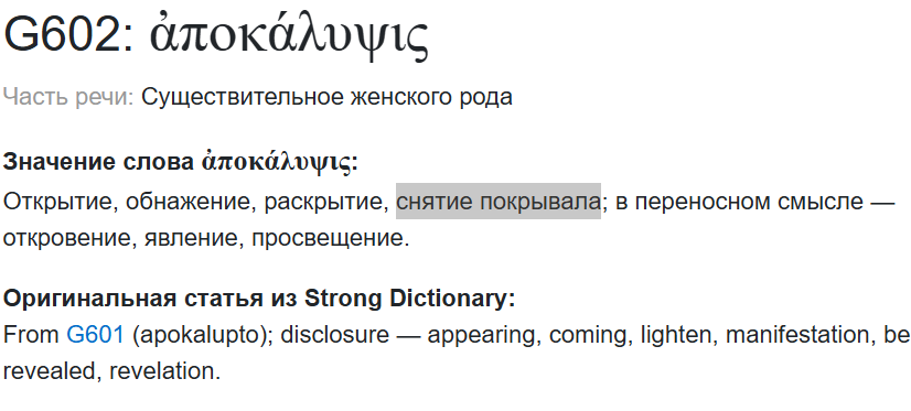 Многие знают первое слово книги "Откровение", но не многие поняли, что апокалипсис давно уже в ходу, и очень многие не поняли, что смысл первого прихода Христа - снятие покрова = сокрушение ЗАВЕСЫ: