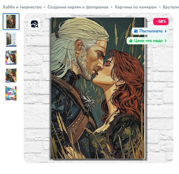 Ранее в одном из постов я уже упомянула тот забавный факт, что заказала картинку на подарок, совершенно не проверив бренд. И когда мне пришли Креатив и Творчество, которые удосужились даже отдельной статьи - я пришла в шок. Времени до вручения подарка и так оставалось впритык, а посему в случае косяков в работе, не было даже возможности что-то исправить. НО. Я не зря упомянула, что продавец в данном случае - Бруталити. Вероятно, они выступают интегратором, и опять же, ВОЗМОЖНО, чуть тщательнее следят за качеством продаваемой продукции. Предлагаю посмотреть, что в итоге получилось. С самого начала картина показалась из разряда "ну как это можно испортить?". Лишь название на коробке напоминало о том, что эти ребята могут всякое.. Я сразу сравнила изображение на коробке с Озон-карточкой, и как будто бы было что-то похожее, но.. Цветокор. Плохо напечатали? Или опять меня ждет сюрприз? Исходное изображение казалось более серым, лицо Ведьмака не таким желтым. Волосы - в обеих версиях выгля