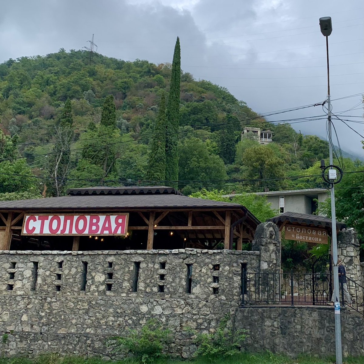 О даче Лакобы в Интернете есть огромное количество информации: просто статей и исторических справок. Я не покушаюсь на лавры достоверного источника о всех правдивых событиях, которые происходили в этом месте. Я расскажу и покажу то, что мы там увидели и услышали. Как я уже говорила, наша прогулка в Гагрипшское ущелье закончилось очень быстро. Вечером у нас намечался концерт абхазских песен и плясок в местном Доме культуры, времени у нас было предостаточно, поэтому мы пошли в старую заброшку - на дачу Лакобы. Здание дачи хорошо просматривается с центральной улицы . Чтобы туда попасть наиболее коротким способом, можно пройти по тропинке вдоль столовой «Бастион», перейти ж/д пути, дальше метров 50 по асфальтированной дороге до гостиницы «Камила». Сразу за «Камилой» начинаются густые заросли. Вот здесь самое интересное. В зарослях нужно рассмотреть ступени: они есть и с правой, и с левой стороны. По опыту знаю , что справо ступени в лучшем состоянии. В прошлом году моя мама хр